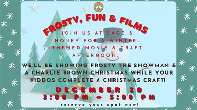 Join us at Sage & Honey for a fun winter-themed movie & craft-filled afternoon. We’ll be showing Frosty the Snowman & A Charlie Brown Christmas while your kiddos complete a christmas craft!